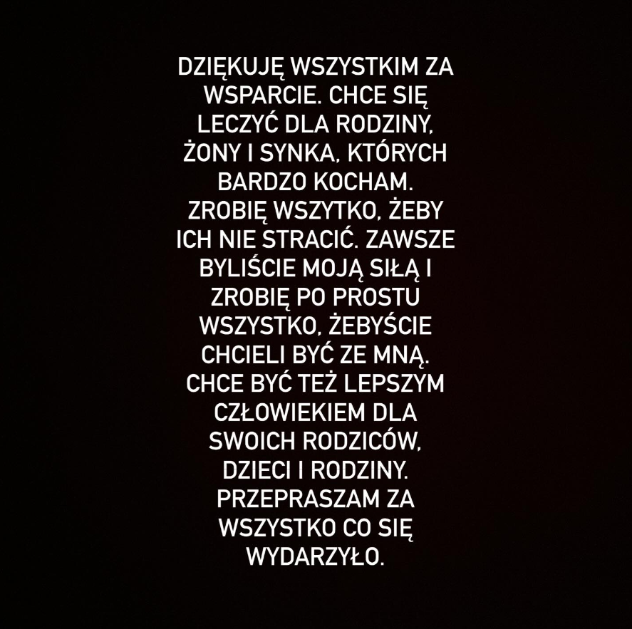 DZIĘKUJĘ WSZYSTKIM ZA WSPARCIE. CHCĘ SIĘ LECZYĆ DLA RODZINY, ŻONY I SYNKA, KTÓRYCH BARDZO KOCHAM. ZROBIĘ WSZYSTKO, ŻEBY ICH NIE STRACIĆ. ZAWSZE BYLIŚCIE MOJĄ SIŁĄ I ZROBIĘ PO PROSTU WSZYSTKO, ŻEBYŚCIE CHCIELI BYĆ ZE MNĄ. CHCĘ BYĆ TEŻ LEPSZYM CZŁOWIEKIEM DLA SWOICH RODZICÓW, DZIECI I RODZINY. PRZEPRASZAM ZA WSZYSTKO CO SIĘ WYDARZYŁO.